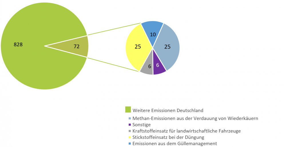Für die Landwirtschaft gilt, dass ihr Anteil an den gesamten deutschen Emissionen mit 72 Millionen Tonnen CO2-Äquivalent bei knapp 8 % liegt.